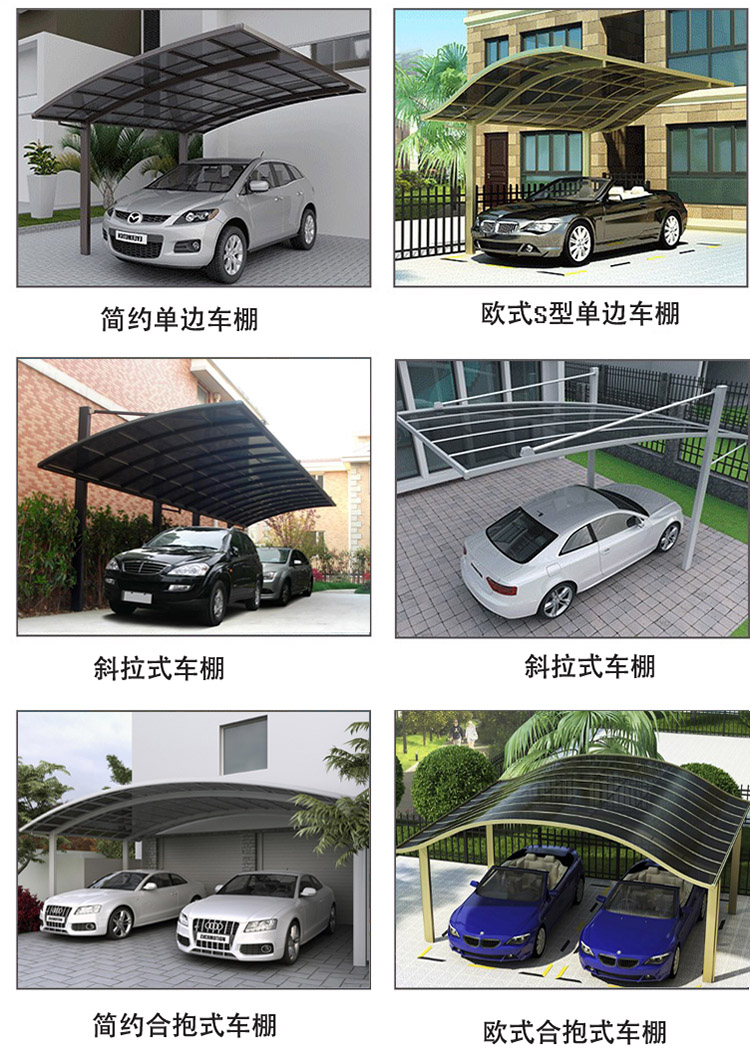 骨架材質:鈦鋁合金 頂棚材質:聚碳酸酯板 面積計算:按頂棚展開面 型材壁厚:1mm-4mm 板材厚度:2mm和3mm 尺寸:可定制 型材工藝:噴涂、電泳、轉印 框架顏色:白色、灰色、咖啡色、香檳色、木紋色 板材顏色:透明、茶色、淺灰色、深灰色、藍色 適用范圍:企業工廠、政府單位、別墅小區 款式選擇:單邊式車棚、合抱式車棚、斜拉式車棚、歐式S型車棚