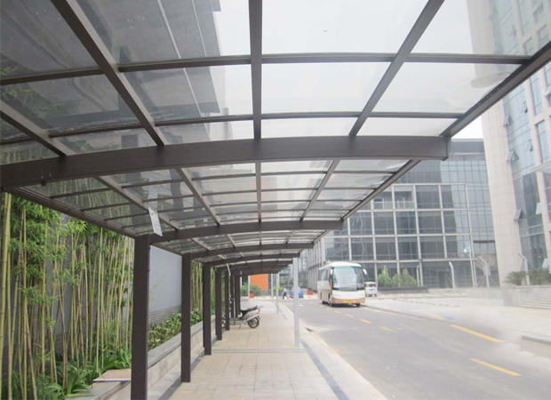 頂棚采用進(jìn)口聚碳酸酯板,抗沖擊是玻璃的數(shù)百倍,有效防止高空墜物