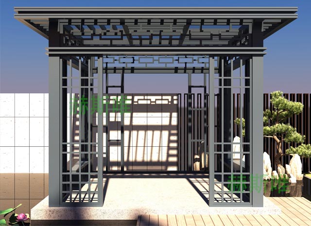 2、 新中式鋁合涼亭可加工性好,可訂、可刨、可鋸、可鉆、可彎可直,可圓可方,可制作各種木制品無法制作的造型。