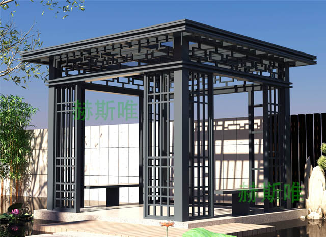 新中式涼亭:新中式涼亭是目前較為受歡迎是一款涼亭樣式,在時間和經驗共同下,符合國家環保的要求,終于打破了普通涼亭的這一缺憾常規,全面利用了鋁合金型材的優勢,完美的打造出了款式多樣的新中式鋁合金涼亭。保留了原來鋁合金涼亭的美感外觀,在外形變化上完美的彌補了其他材質不能做到的多變化,不能隨著環境變換而變化的有以下的特點。