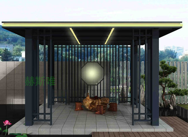 2、 新中式鋁合涼亭可加工性好,可訂、可刨、可鋸、可鉆、可彎可直,可圓可方,可制作各種木制品無法制作的造型。