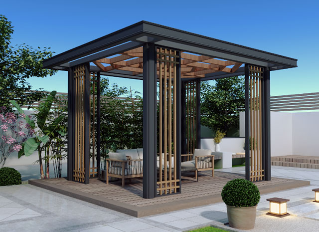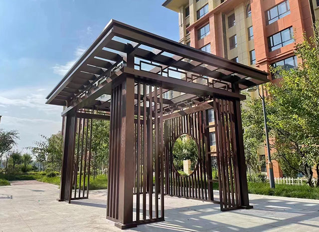 7、新中式鋁合涼亭顏色豐富,可供選擇的顏色眾多。既具有天然木質感和木質紋理,又可以根據自己的個性來定制需要的顏色。
